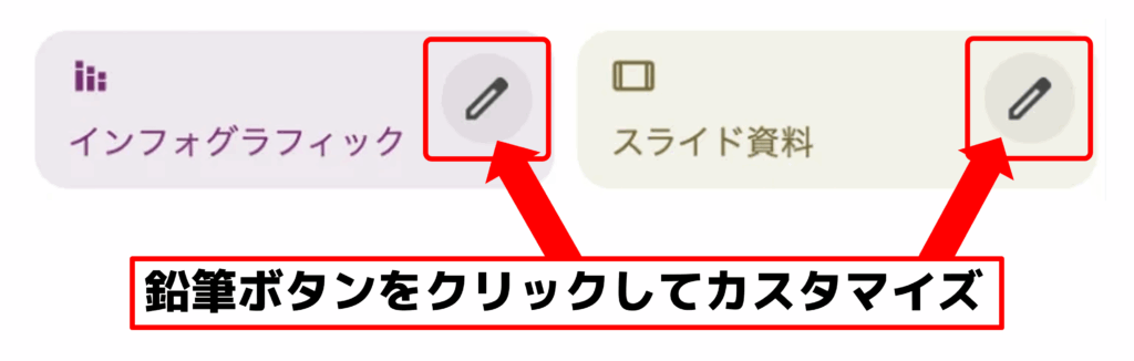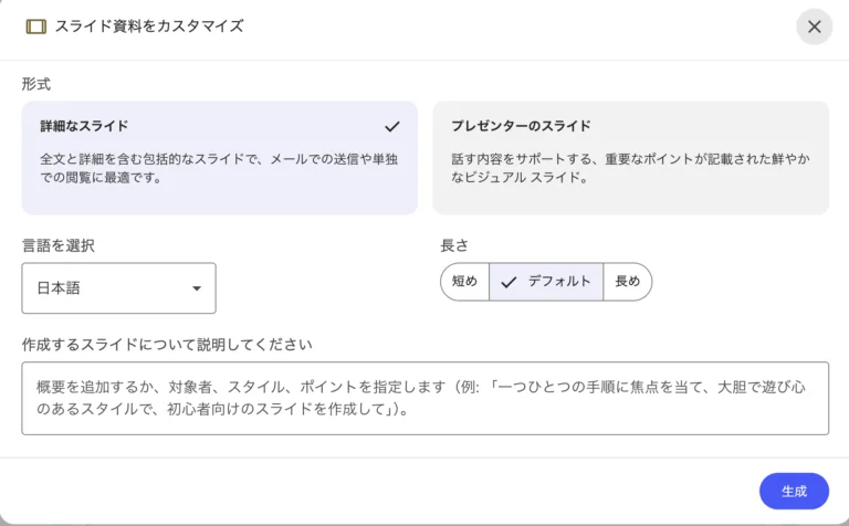 | 長さ/詳細度 | スライドの枚数(短め、デフォルト、長め)や、インフォグラフィックの詳細レベル(完結、標準、詳細)を指定します。 |