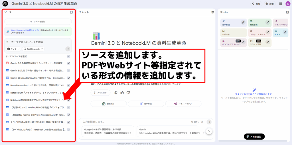 生成したスライドの元の資料となるPDFやWebサイトなど指定されている形式の情報を「ソース」パネルに追加します。