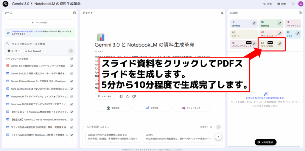作成したいスライドトピックに特化した、絞り込まれた関連性の高いソース群でノートブックを構成します。ノイズとなる不要な情報が入っていると、AIが主要な論点を正確に識別しにくくなる可能性があります。