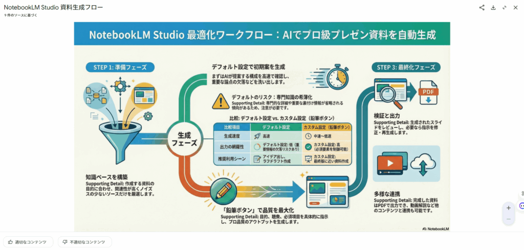 Studioパネルから「スライド」または「インフォグラフィック」を選択し、デフォルト設定で生成を試行します。これは、AIがソースから抽出した主要な論点や構成を確認し、欠落している重要な情報がないか特定するための「初期草案」として扱います。
